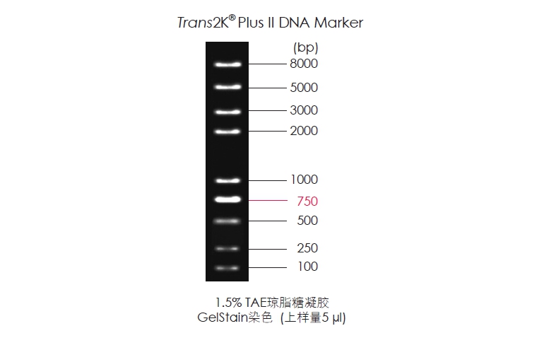 Trans2K? Plus II DNA Marker由9條線狀雙鏈DNA條帶組成,適用于瓊脂糖凝膠電泳中DNA條帶的分析,不建議用于聚丙烯酰胺凝膠電泳。本產(chǎn)品為即用型產(chǎn)品,已含有1×Loading Buffer,可根據(jù)實驗需要,直接取5 μl電泳,使用方便,電泳圖像清晰。其中750 bp條帶濃度為100 ng/5 μl,顯示亮帶,其余條帶濃度均為50 ng/5 μl。便于準(zhǔn)確判斷目的產(chǎn)物DNA的量。