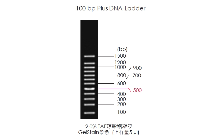 100 bp Plus DNA Ladder是由12條線狀雙鏈DNA條帶組成,適用于瓊脂糖凝膠電泳中DNA條帶的分析。本產(chǎn)品為即用型產(chǎn)品,已含有1×Loading Buffer,可根據(jù)實驗需要,直接取5 μl電泳,使用方便,電泳圖像清晰。其中500 bp條帶濃度為100 ng/5 μl,顯示亮帶,其余條帶濃度均為50 ng/5 μl。便于準(zhǔn)確判斷目的產(chǎn)物DNA的量。