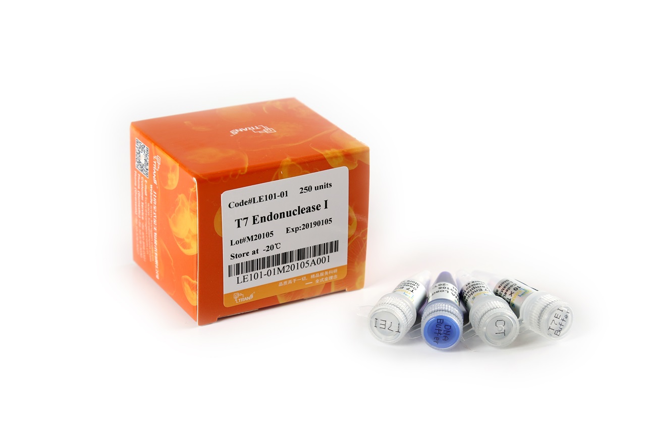 本產(chǎn)品由重組T7 Endonuclease I(T7EI)基因的載體,在大腸桿菌中經(jīng)誘導表達、純化而成。T7EI識別并切割不完全配對、含十字形結(jié)構(gòu)、Holliday結(jié)構(gòu)、異源雙鏈的DNA以及隨機切割單鏈DNA。該酶切割位點在錯配堿基5'端的第一、第二或第三個磷酸二酯鍵。