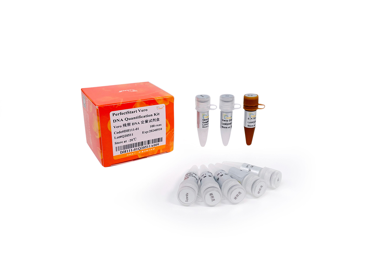 本產(chǎn)品原理為利用在PCR體系中加入熒光探針 (TaqMan或Molecular Beacon等),擴增過程中其熒光量與擴增產(chǎn)物量成正比,通過熒光量的檢測測定樣品核酸量。本產(chǎn)品中的Vero qPCR SuperMix (2×)含PerfectStart Taq熱啟動酶 (利用3種單克隆抗體與Taq DNA Polymerase高效結合,有效地封閉了DNA聚合酶活性,阻止了低溫下的非特異性擴增)、針對Vero細胞DNA檢測特殊優(yōu)化的qPCR反應緩沖液、dNTPs、PCR增強劑、穩(wěn)定劑。此外,本反應液引入了dUTP/UDG系統(tǒng),可在反轉錄前降解含U的ssDNA和dsDNA,消除由PCR產(chǎn)物導致的交叉污染。