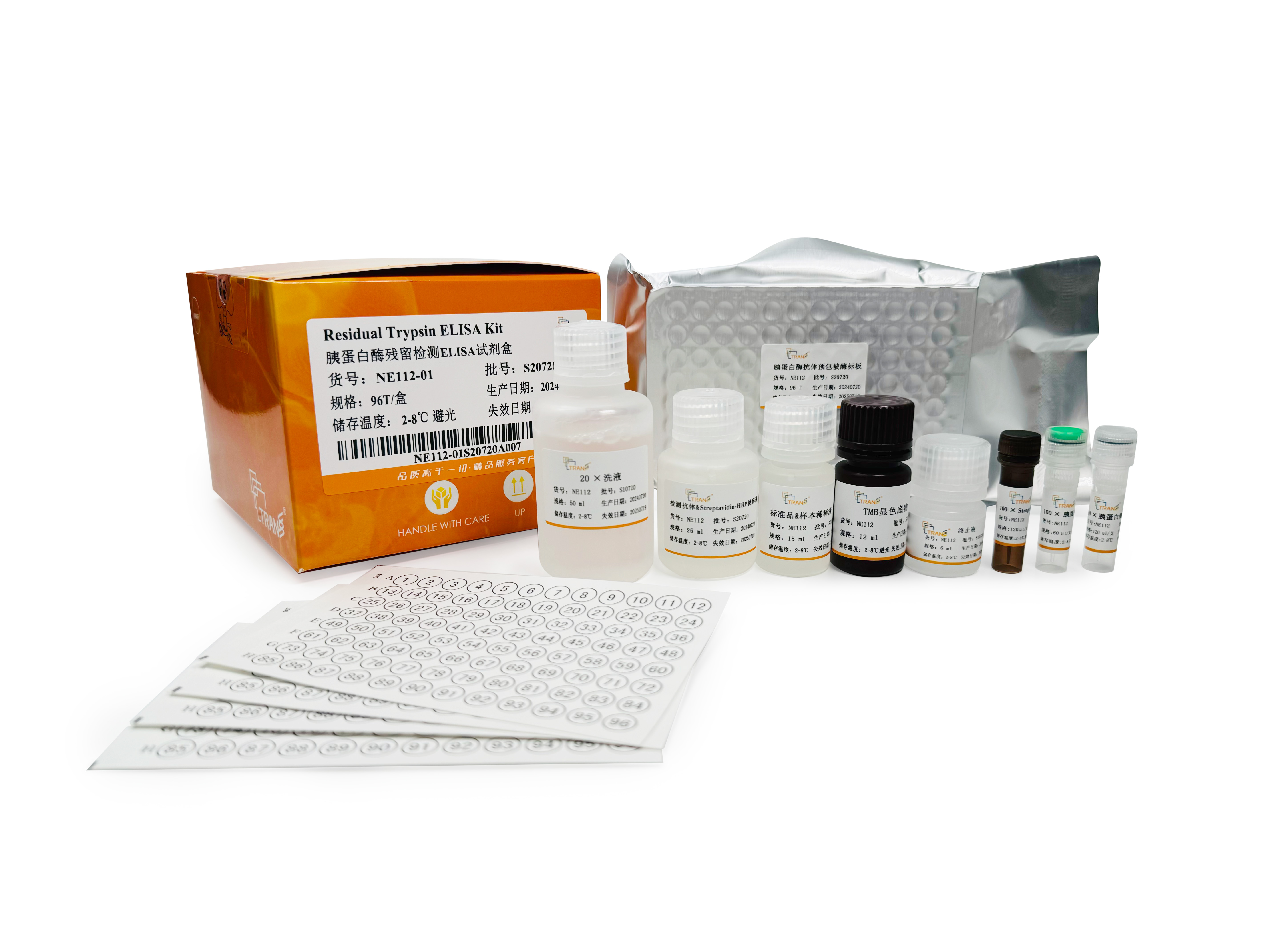 胰蛋白酶(Trypsin)是一種絲氨酸蛋白酶,可特異性切割賴氨酸及精氨酸C末端肽鍵。胰蛋白酶常用于多種生物制品的生產(chǎn)工藝中,例如重組胰島素的生產(chǎn),重組蛋白藥物或融合表達工藝中的酶切,疫苗和干細(xì)胞生產(chǎn)工藝中細(xì)胞的處理。本試劑盒采用雙抗體夾心ELISA法,可用于生物制品中重組以及天然(豬胰腺)來源豬胰蛋白酶的微量殘留檢測。本試劑盒采用高親和力的抗豬胰蛋白酶抗體預(yù)包被酶標(biāo)板,將標(biāo)準(zhǔn)品/待測樣本和生物素標(biāo)記的抗豬胰蛋白酶檢測抗體同步加入微板孔中,經(jīng)過孵育后樣本中存在的胰蛋白酶會與酶標(biāo)板上的預(yù)包被抗體及檢測抗體特異性結(jié)合。洗滌去除未結(jié)合物后,將辣根過氧化物酶標(biāo)記的鏈霉親和素(Streptavidin-HRP)加至微孔板中并孵育,通過檢測抗體上的生物素和鏈霉親和素發(fā)生的高強度非共價結(jié)合,形成“包被抗體-胰蛋白酶-檢測抗體-Streptavidin-HRP”免疫復(fù)合物。再次洗滌后,將顯色底物TMB加至微板孔中,HRP會催化TMB底物生成藍(lán)色產(chǎn)物,顏色反應(yīng)的深淺將與樣本中胰蛋白酶的濃度成正相關(guān)。而后加入終止液終止反應(yīng),在450 nm波長(參考波長570-630 nm)處測定吸光度值。通過繪制標(biāo)準(zhǔn)曲線,由樣本吸光度值可計算出樣本中所含胰蛋白酶濃度。本試劑盒特異性強、檢測靈敏度高,同時操作更加便捷。
