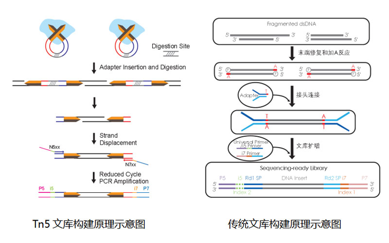 其文庫構(gòu)建原理與傳統(tǒng)文庫構(gòu)建的DNA片段化、末端修復(fù)加A、接頭連接、文庫擴(kuò)增流程不同,Tn5 DNA二代測序文庫構(gòu)建是利用Tn5轉(zhuǎn)座酶將含有酶切位點(diǎn)的接頭序列隨機(jī)插入到DNA序列中,只需一步酶切即可完成片段化,接下來只需進(jìn)行文庫擴(kuò)增,即可上機(jī)測序。