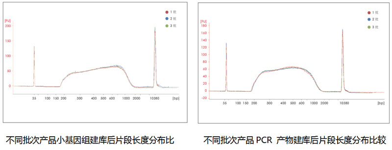 結(jié)果表明不同批次產(chǎn)品片段長度分布一致,主要分布在200~2000 bp 之間,峰型的一致性與產(chǎn)量的一致性好,產(chǎn)品批次間的穩(wěn)定性非常好!