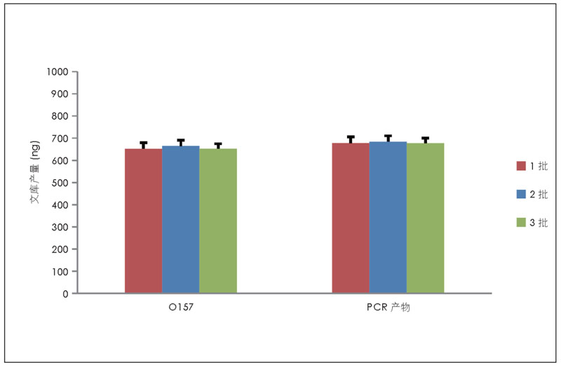以1 ng 大腸桿菌O157 基因組DNA 和PCR 混合產(chǎn)物 (4 kb、2 kb、1 kb 和500 bp PCR 產(chǎn)物等摩爾混合)為樣品,分別使用不同批次產(chǎn)品構(gòu)建全基因組短片段文庫,擴(kuò)增12 個循環(huán),產(chǎn)物經(jīng)1.0×DNA 磁珠(TransGen, EC411) 純化( 不進(jìn)行文庫片段長度分選),文庫經(jīng)Agilent 高靈敏DNA 芯片鑒定,Qubit 檢測文庫濃度,計算文庫產(chǎn)量。