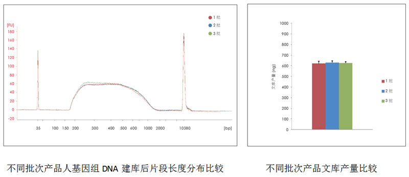 以5 ng 人基因組DNA 為樣品,分別使用不同批次產(chǎn)品構(gòu)建全基因組短片段文庫,擴(kuò)增9 個循環(huán),產(chǎn)物經(jīng)1.0×DNA磁珠(TransGen, EC411) 純化(不進(jìn)行文庫片段長度分選),文庫經(jīng)Agilent 高靈敏DNA 芯片鑒定,Qubit 檢測文庫濃度,計算文庫產(chǎn)量。