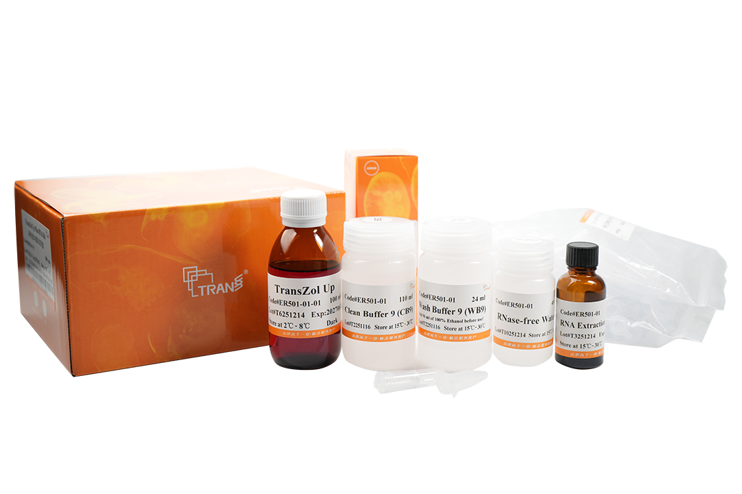 本試劑盒適用于從細(xì)胞和組織中提取總RNA,用TransZol Up裂解樣品,加入RNA Extraction Agent后,溶液分為無(wú)色水相和粉紅色有機(jī)相,RNA在水相中;用硅膠膜離心柱特異吸附水相中的RNA,與其它總RNA提取方法相比,既具有TransZol Up裂解能力強(qiáng)、提取量高,應(yīng)用范圍廣的優(yōu)點(diǎn),又具有離心柱提取RNA純度高的優(yōu)點(diǎn)。