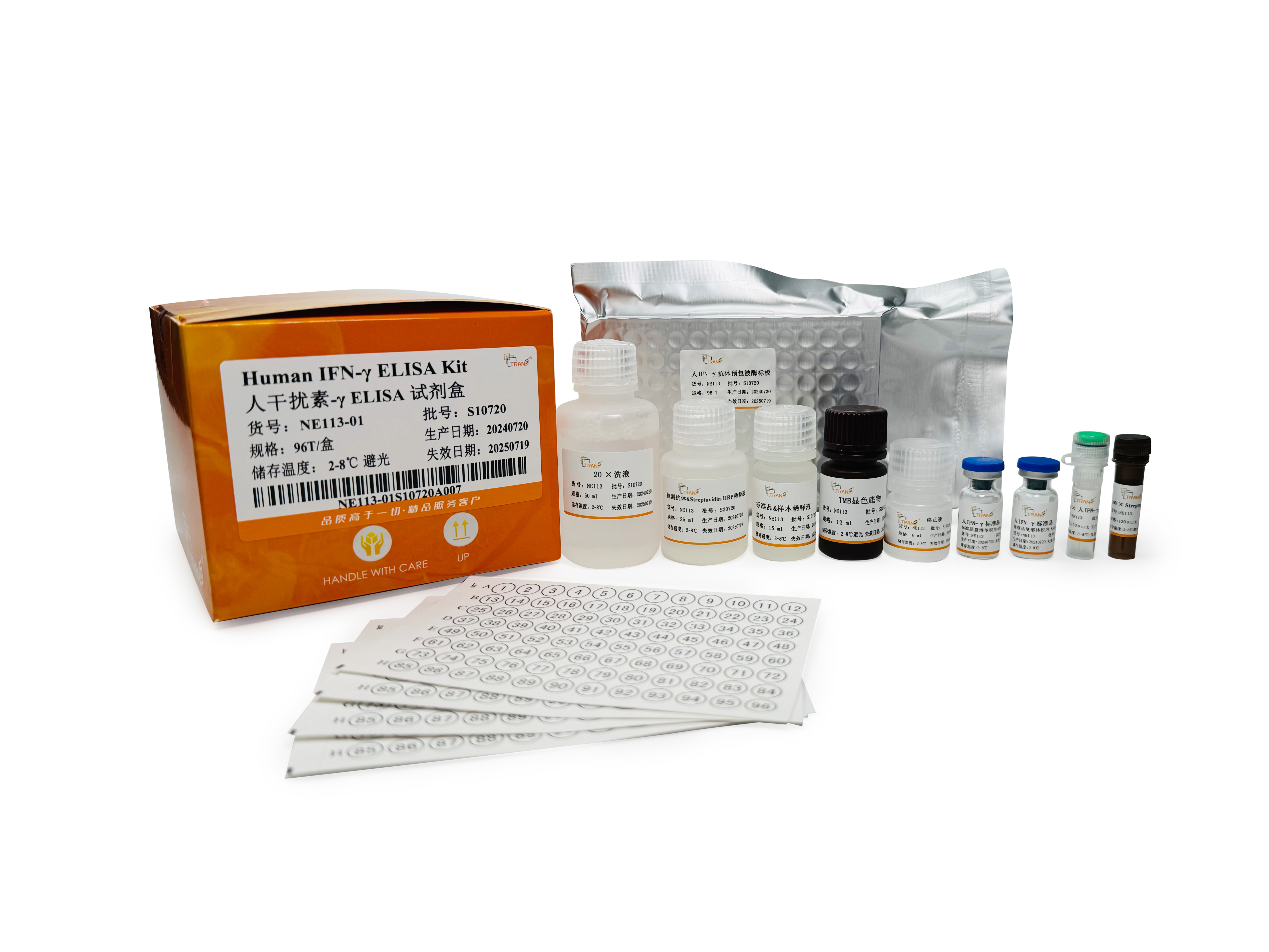 本試劑盒采用雙抗體夾心ELISA法定量測定人血清、血漿和細胞培養(yǎng)上清中的IFN-γ含量。本試劑盒采用高親和力的抗人IFN-γ抗體預包被酶標板,將標準品/待測樣本和生物素標記的抗人IFN-γ檢測抗體同步加入微板孔中,經(jīng)過孵育后樣本中存在的IFN-γ會與酶標板上的預包被抗體和檢測抗體特異性結(jié)合。洗滌去除未結(jié)合物后,將辣根過氧化物酶標記的鏈霉親和素(Streptavidin-HRP)加至微孔板中并孵育,通過檢測抗體上的生物素和鏈霉親和素發(fā)生的高強度非共價結(jié)合,形成“包被抗體-人IFN-γ蛋白-檢測抗體-Streptavidin-HRP”免疫復合物。再次洗滌后,將顯色底物TMB加至微板孔中,HRP會催化TMB底物生成藍色產(chǎn)物,顏色反應的深淺將與樣本中IFN-γ的濃度成正相關(guān)。而后加入終止液終止反應,在450 nm波長(參考波長570 - 630 nm)處測定吸光度值。通過繪制標準曲線,由樣本吸光度值可計算出樣本中所含IFN-γ濃度。本試劑盒特異性強、檢測靈敏度高,同時操作更加便捷。