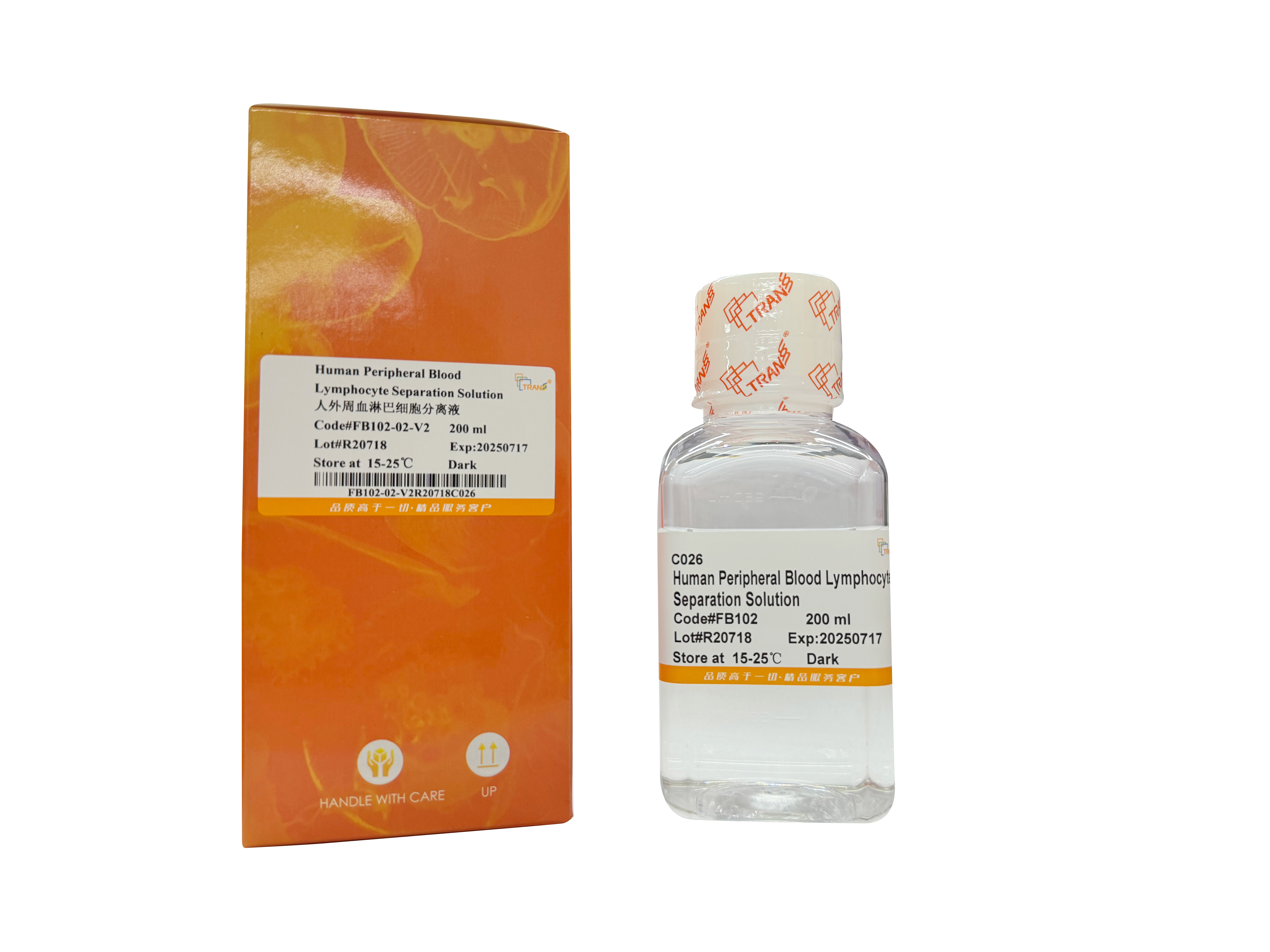 外周血中單個核細(xì)胞 (主要為淋巴細(xì)胞) 的體積、形態(tài)和密度與其他細(xì)胞均不同。紅細(xì)胞和粒細(xì)胞密度較大,為1.090 g/ml 左右,血小板為1.030~1.035 g/ml,而單個核細(xì)胞密度為1.075~1.090 g/ml。本產(chǎn)品是一種無菌、近于等滲、密度為(1.077±0.001) g/ml (20℃) 的葡聚糖及泛影葡胺溶液。利用本產(chǎn)品對人抗凝血做密度梯度離心時,紅細(xì)胞和粒細(xì)胞密度大,沉于分離液底部;外周血單個核細(xì)胞 (主要為淋巴細(xì)胞) 密度稍低于分離液,位于分離液界面上,從而可獲得純度較高的淋巴細(xì)胞。本產(chǎn)品即用型,無菌條件下所分離的淋巴細(xì)胞可用于體外培養(yǎng)和免疫學(xué)檢測。