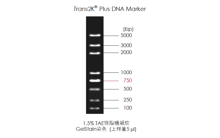 Trans2K?Plus DNA Marker由8條線狀雙鏈DNA條帶組成,適用于瓊脂糖凝膠電泳中DNA條帶的分析,不建議用于聚丙烯酰胺凝膠電泳。本產(chǎn)品為即用型產(chǎn)品,已含有1×Loading Buffer,直接取5 μl電泳,使用方便,電泳圖像清晰。其中750 bp條帶濃度為100 ng/5 μl ,顯示亮帶,其余條帶濃度均為50 ng/5 μl。便于準(zhǔn)確判斷目的產(chǎn)物DNA的量。