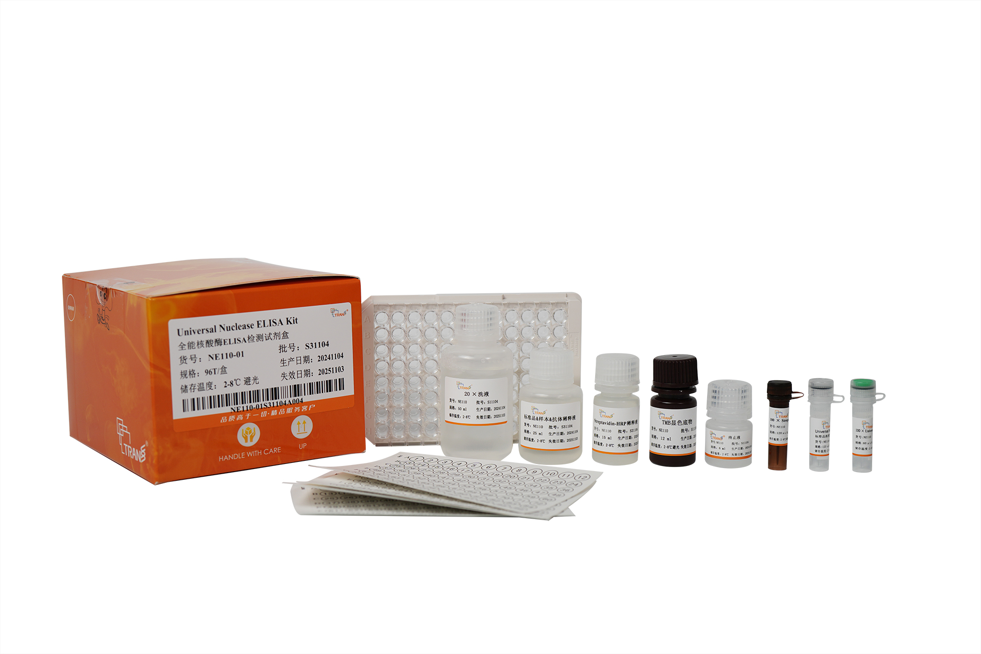 本試劑盒采用雙抗體夾心ELISA法定量測定生物制品中Universal Nuclease的殘留量。本試劑盒采用高親和力的Universal Nuclease抗體預包被酶標板,將標準品/待測樣本和生物素標記的抗Universal Nuclease檢測抗體同步加入微板孔中,經(jīng)過孵育后樣本中存在的Universal Nuclease會與酶標板上的預包被抗體及檢測抗體特異性結(jié)合。洗滌去除未結(jié)合物后,將辣根過氧化物酶標記的鏈霉親和素(Streptavidin-HRP)加至微孔板中并孵育,通過檢測抗體上的生物素和鏈霉親和素發(fā)生的高強度非共價結(jié)合,形成“包被抗體- Universal Nuclease蛋白-檢測抗體-Streptavidin-HRP”免疫復合物。再次洗滌后,將顯色底物TMB加至微板孔中,HRP會催化TMB底物生成藍色產(chǎn)物,顏色反應的深淺將與樣本中Universal Nuclease的濃度成正相關(guān)。而后加入終止液終止反應,在450 nm波長(參考波長570 - 630 nm)處測定吸光度值。通過繪制標準曲線,由樣本吸光度值可計算出樣本中所含Universal Nuclease濃度。本試劑盒特異性強、檢測靈敏度高,同時操作更加便捷。