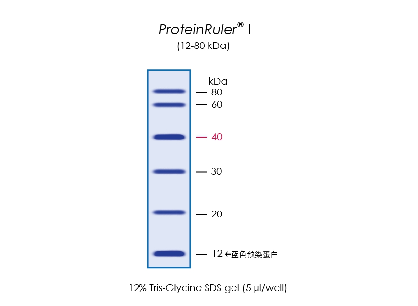 ProteinRuler? I由6種重組蛋白質(zhì)組成,分子量范圍為12 kDa-80 kDa。經(jīng)SDS-PAGE電泳后,用考馬斯亮藍(lán)染色可見(jiàn)清晰的6條帶。12 kDa為藍(lán)色預(yù)染蛋白,便于動(dòng)態(tài)觀察蛋白質(zhì)電泳狀態(tài)。40 kDa為加亮條帶,便于分子量鑒定。